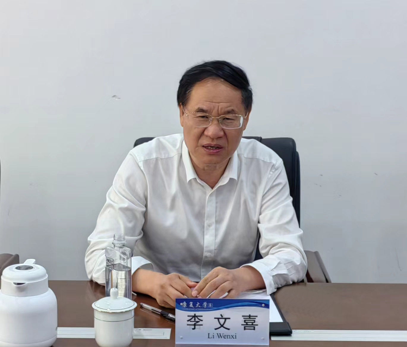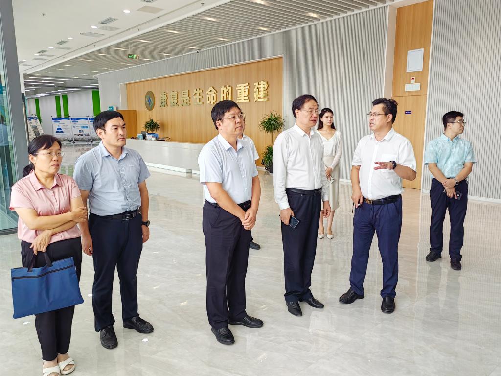 在康复大学,李文喜一行实地察看了康复大学校区建设情况,参观了康复大学科研实验室、教学区、学生宿舍、图书馆等工作场所,观看了学校筹建工作视频汇报片,全面了解学校建设和规划布局。座谈会上,康复大学(筹)领导小组成员、临时党委委员黄飞对李文喜一行表示热烈欢迎,并详细介绍了康复大学建设背景、筹建历程、办学愿景和使命、科研平台建设、人才队伍建设等基本情况。