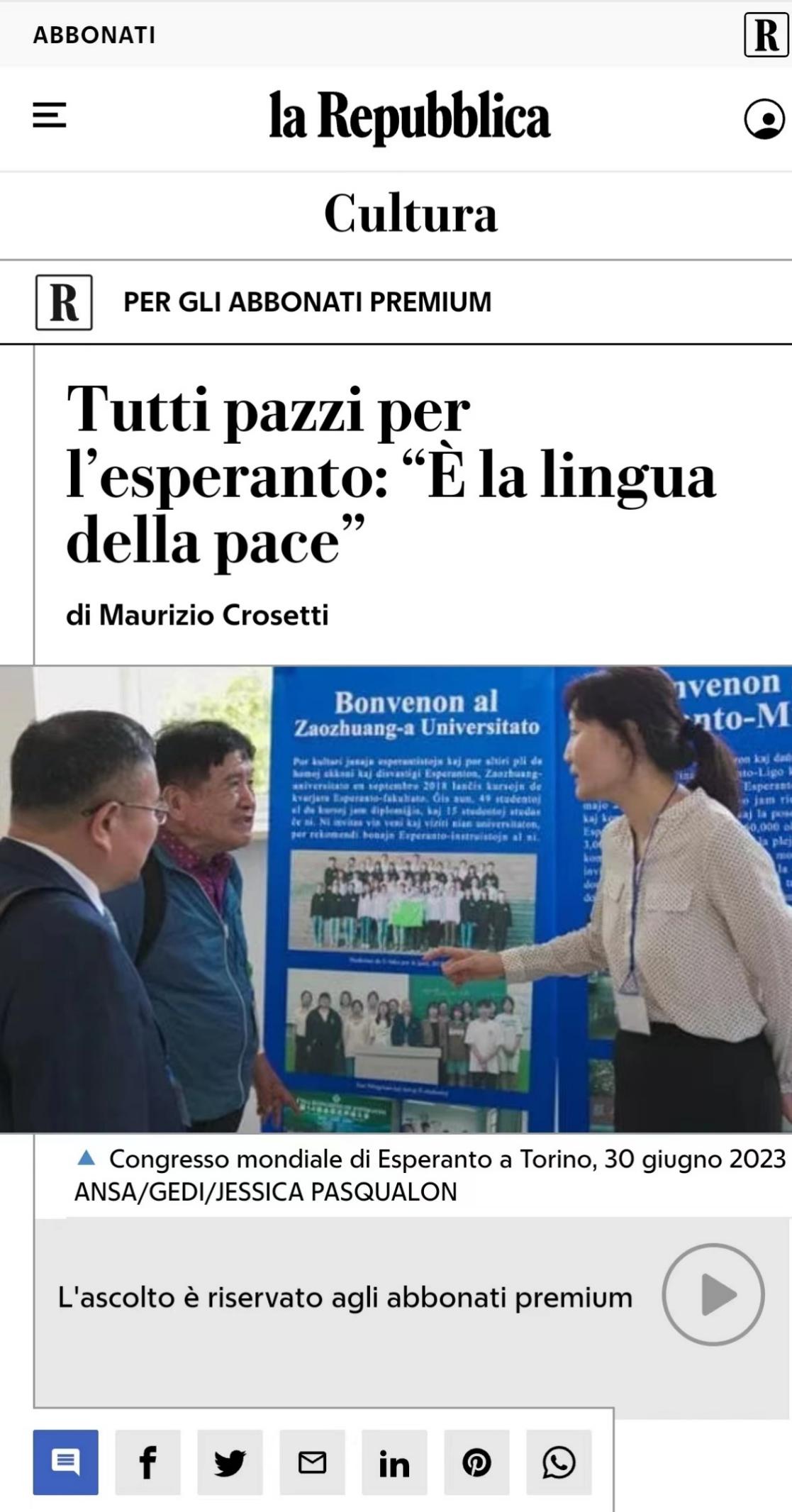 大会期间,李目海代表学校接收了德国世界语者Zsofia Korody向永利官网世界语博物馆捐赠的国际世界语教师协会机关报及协会出版的杂志。此外,“中国日”的活动受到意大利媒体的关注,7月31日,意大利第二大发行量报纸《共和报》(la Repubblica)对“中国日”永利总站ylzz55世界语推进情况进行了报道。