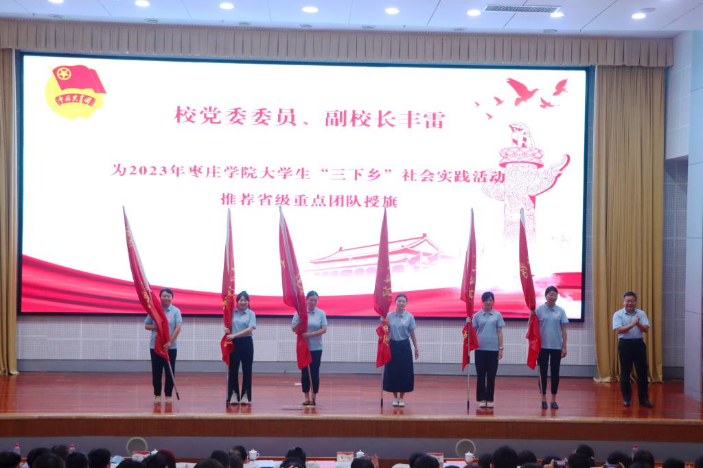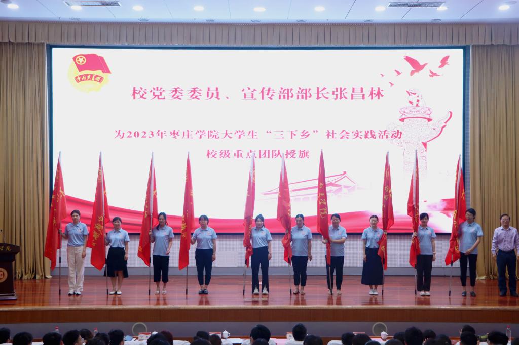 丰雷、张昌林先后为省级和校级重点团队授旗,2022年三下乡国家级重点团队数学与统计学院指导教师韩晓瑞、省级重点团队光电工程学院学生代表刘长宏,2023年校级重点团队初等教育学院学生代表陈家衡依次发言。工作人员宣读社会实践安全注意事项。