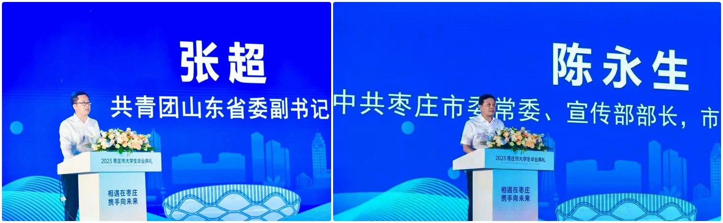典礼在《青春枣庄》宣传片中拉开序幕。在活动第一篇章“拂晓之光”,张超致辞指出,全省各级共青团组织以青年为本,推出了一系列品牌工作,千方百计为青年排忧解难,努力使共青团组织成为广大青年遇到困难时想得起、找得到、靠得住的力量。希望同学们继续砥砺奋斗,撸起袖子加油干,在攻坚克难中创新创造创业,用青春和汗水创造出属于自己的“一域之光”。陈永生在致辞中说,枣庄共同为2.5万名驻枣高校应届毕业生举办一场专属的毕业盛典,希望毕业生们眼里有光、心怀理想,坚定不移听党话、跟党走,将青春梦融入中国梦,让青春在新时代的火热实践中绽放绚丽之花。枣庄正以更加开放的格局,全方位打造青年发展型城市,热切期待同学们能够留在枣庄、创业枣庄,共创更加美好的未来。
