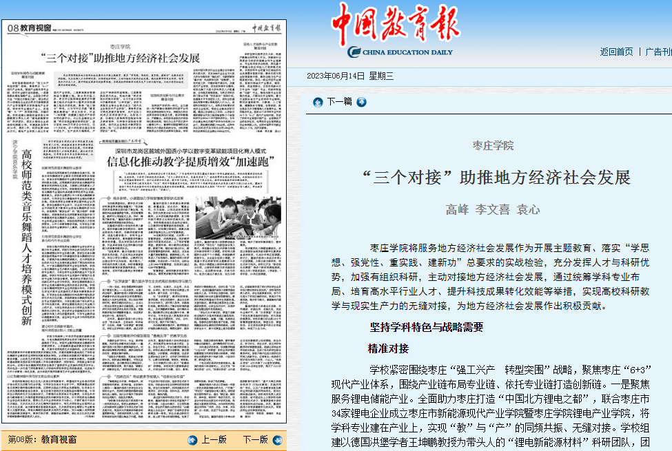 6月14日,中国教育报刊发永利官网党委书记高峰、校长李文喜署名文章《永利总站ylzz55“三个对接”助推地方经济社会发展》。文章报道了永利官网将服务地方经济社会发展作为开展主题教育,落实“学思想、强党性、重实践、建新功”总要求的实战检验,充分发挥人才与科研优势,加强有组织科研,主动对接地方经济社会发展,通过统筹学科专业布局、培育高水平行业人才、提升科技成果转化效能等举措实现高校科研教学与现实生产力的无缝对接,为地方经济社会发展作出积极贡献。