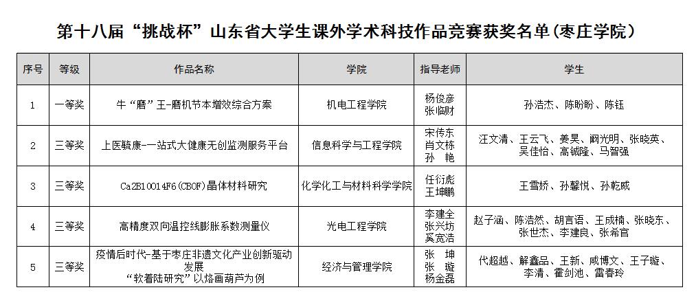 5月18日至22日,由共青团山东省委、山东省教育厅、山东省科学技术厅、山东省科学技术协会、山东社会科学院、山东省学生联合会主办,齐鲁工业大学(山东省科学院)、潍坊职业学院承办的第十八届“挑战杯”山东省大学生课外学术科技作品竞赛在齐鲁工业大学(山东省科学院)长清校区艺体中心礼堂落下帷幕。永利官网参赛团作品喜获省赛一等奖1项、三等奖4项,获奖作品覆盖了本届“挑战杯”赛事全部赛道。