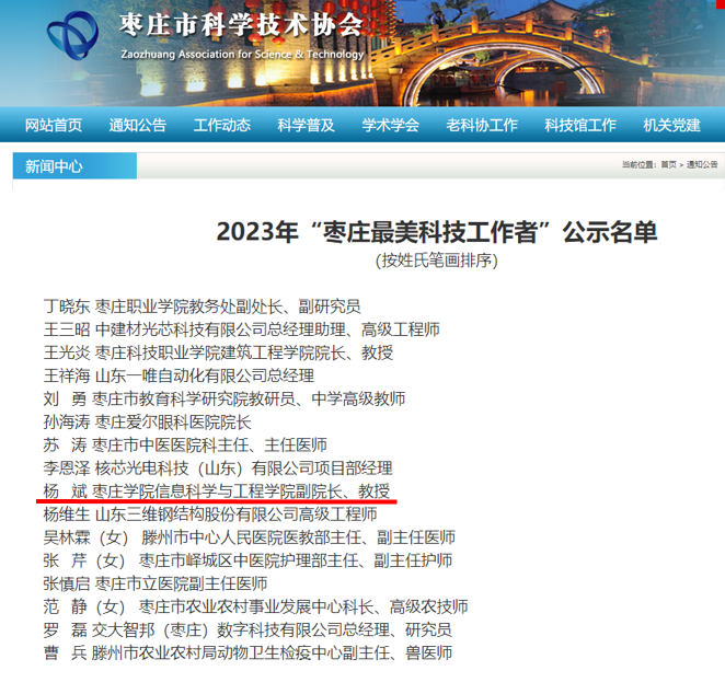 近日,中共枣庄市委宣传部、市科协、市科技局、市全民科学素质工作领导小组办公室联合公布了2023年“枣庄最美科技工作者”名单,永利官网信息科学与工程学院副院长杨斌教授荣获“枣庄最美科技工作者”称号。