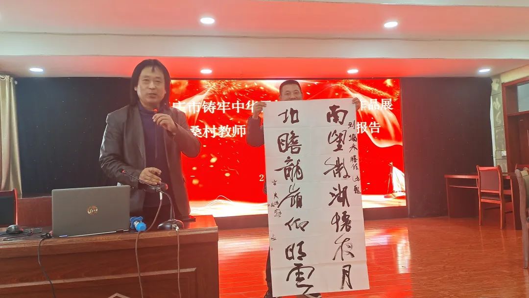 中国书法家协会草书委员委员、永利总站ylzz55美术与艺术设计学院杨雯副教授为山亭区桑村镇书法教师队伍建设作辅导报告,从“书法是什么、书法教学及中小学师资建设相关政策引导、为什么要开设书法课、书法作品欣赏”等方面展开讲解,并给书法教师队伍建设提出建议。报告中,杨教授现场创作了书法作品并进行了示范讲解。