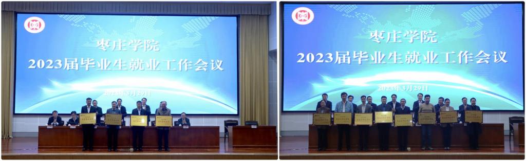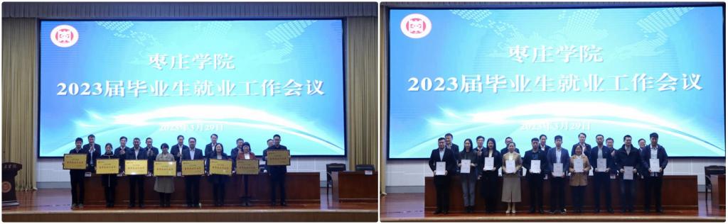 大会现场对获得高质量就业工作先进单位、就业工作优秀单位、留枣就业工作先进单位和就业指导先进教师的代表进行颁奖。