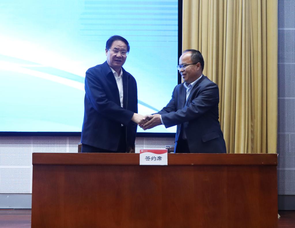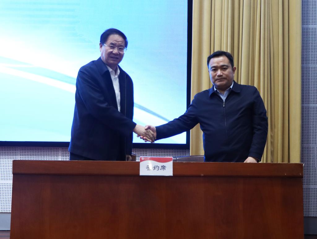 李文喜代表学校与二级学院代表数学与统计学院党总支书记王海峰、外国语学院党总支书记盛清银签订2023届毕业生就业工作目标责任书。
