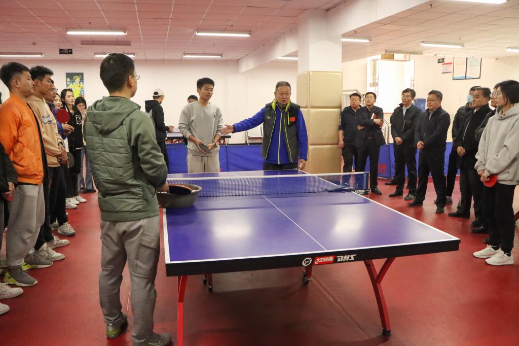 报告结束后,在副校长丰雷、安涛陪同下,任国强与师生亲切交流并对乒乓球授课环节进行现场指导。