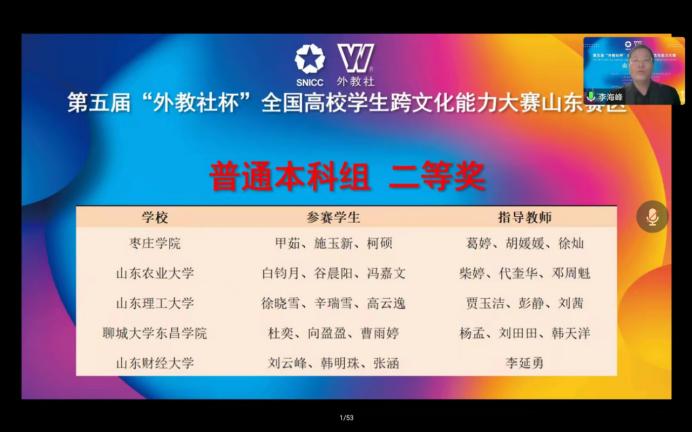 “外教社杯”全国高校学生跨文化能力大赛(SNICC)是由中国教育国际交流协会指导、上海外国语大学主办、上海外语教育出版社承办的一项赛事。大赛以服务国家战略和外语能力建设需求为宗旨,以“坚定文化自信 增进国际理解”为主题,本着“以赛促学、以赛促教”的理念,为高校师生搭建一个展示跨文化能力风采、交流跨文化教学经验的平台。迄今为止,该项赛事已成功举办五届,山东省赛区为首次举办。