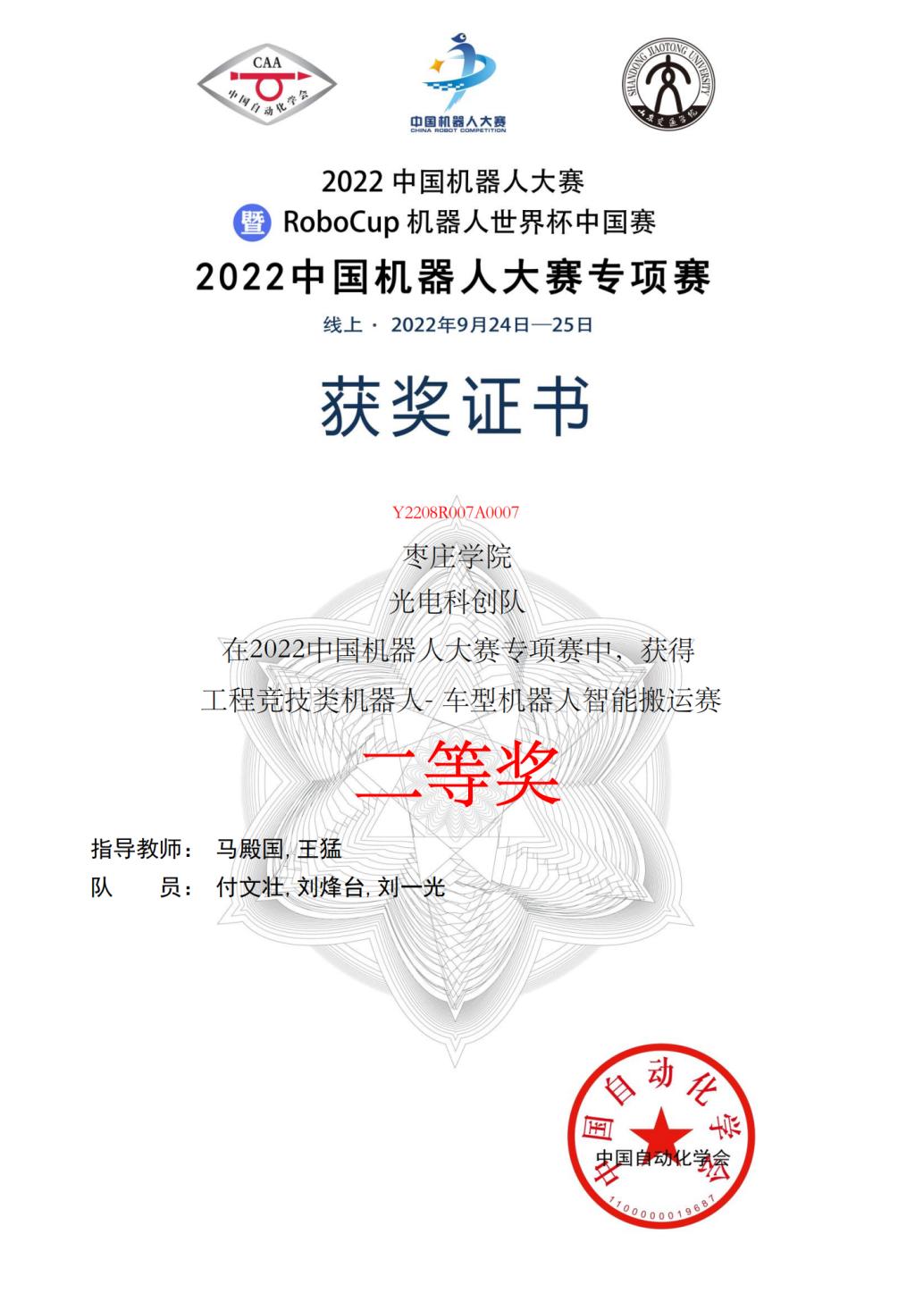 近日,由中国自动化学会主办的2022中国机器人大赛(已列入《全国普通高校学科竞赛排行榜》)专项赛落下帷幕。由永利官网光电工程学院学子组成的光电科创队参加工程竞技类机器人-车型机器人智能搬运赛获得二等奖,创永利官网参加本赛项比赛以来的最好成绩。