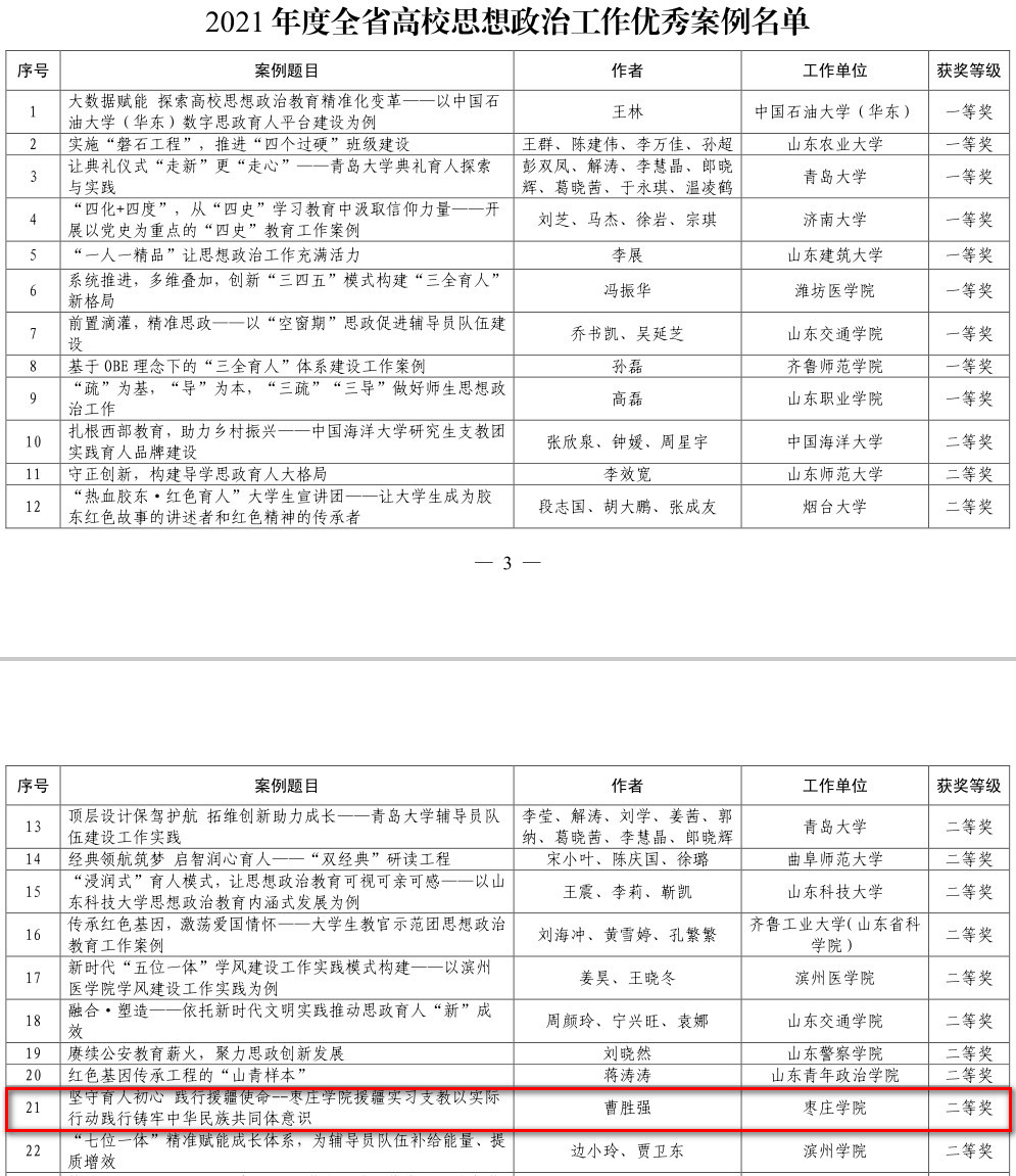近日,2021年度山东省高校思想政治工作优秀案例征集活动评选结果揭晓,永利官网党委书记曹胜强主持的《坚守育人初心 践行援疆使命——永利总站ylzz55援疆实习支教以实际行动铸牢中华民族共同体意识》案例荣获二等奖。