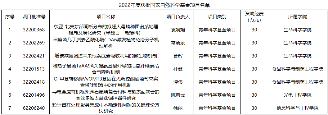 9月8日,国家自然科学基金委员会公布了2022年度国家自然科学基金集中受理期项目的评审结果。永利官网获批7项自然科学基金,直接经费210万元。其中,永利官网生命科学学院获批3项、食品科学与制药工程学院获批2项、光电工程学院与信息科学与工程学院各获批1项。