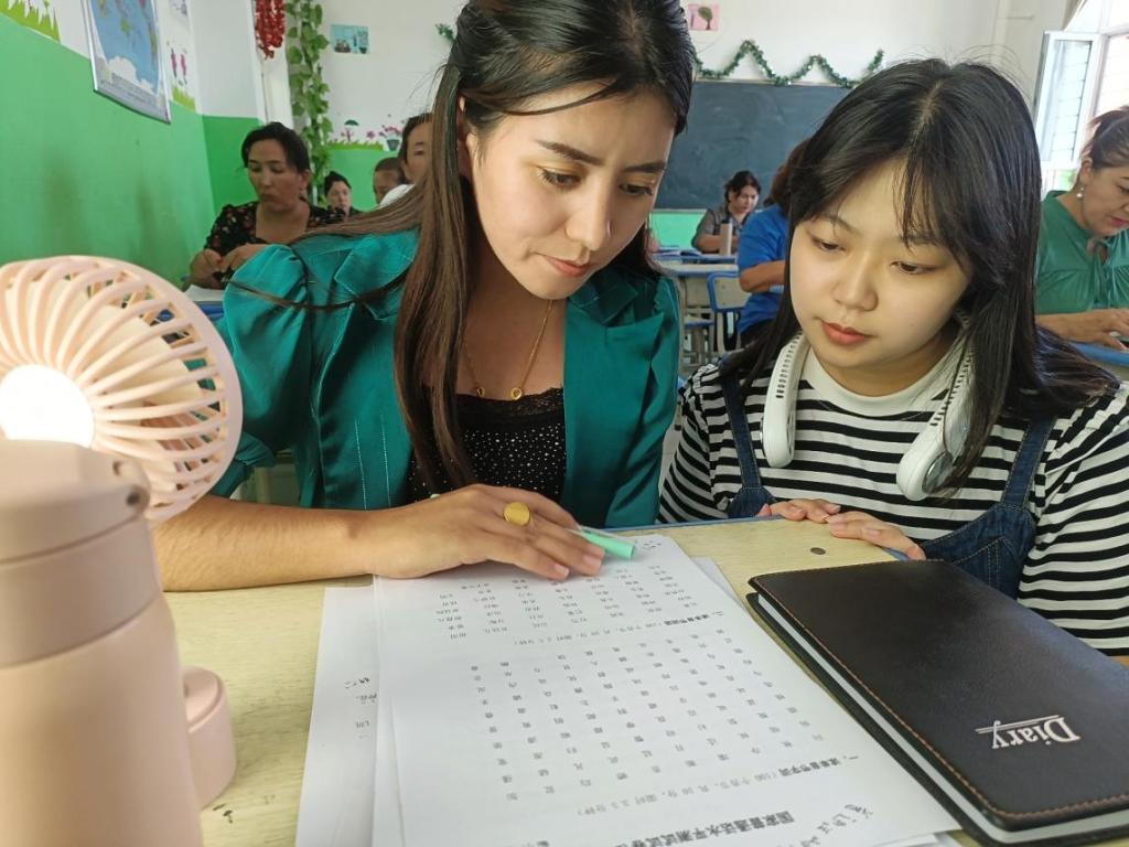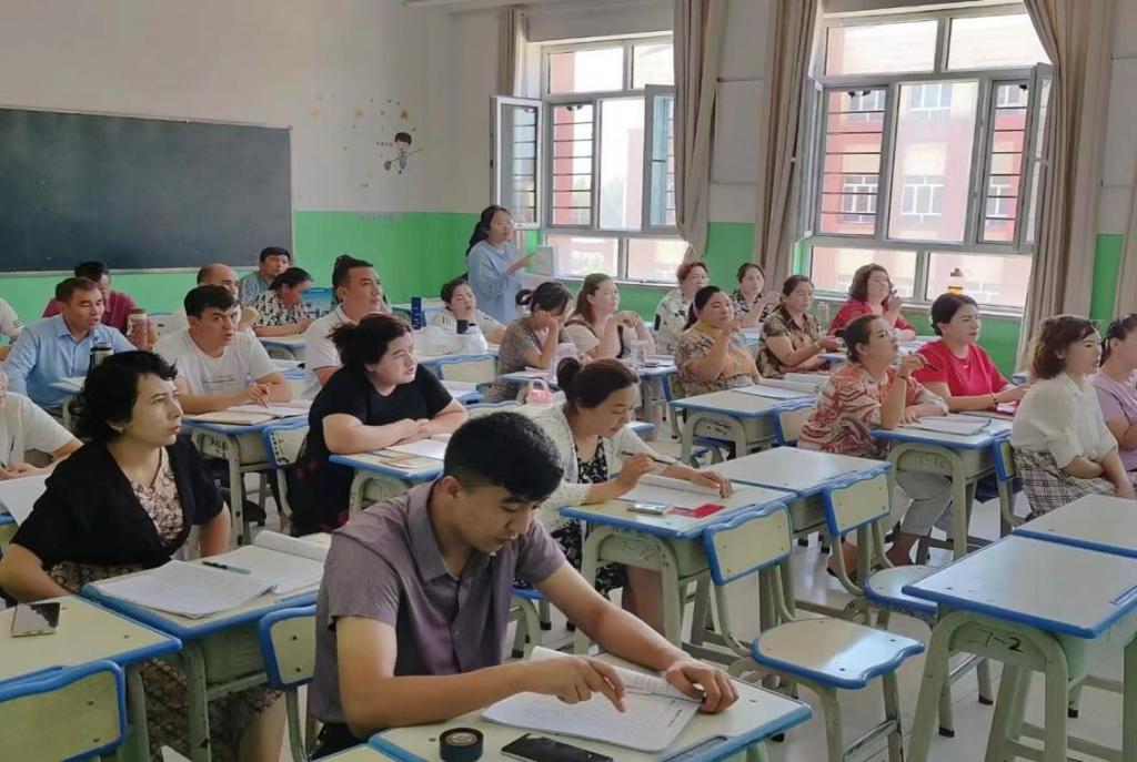 此次线下集中培训共有200名疏勒县中小学、幼儿园教师骨干教师参加。永利总站ylzz55普通话培训团队一行共14人,领队教师姜夫军、徐颖慧带领团队精心制定了培训方案,采取训前摸底、分层编班,强化语言培训、全真模拟、指导、训后测等方式进行培训。培训团队成员具有较强的语音感知能力与丰富的语言教学经验,在充分发挥自身知识优势的基础上,系统分析学员的民族语言特点及发音习惯,围绕考试题型与学员实际应用需求设计课程。培训过程中注重结合当地语音面貌,不断调整教学方案、策略,寻找在疏勒县精准推广普通话工作的着力点,搭建与参训学员们长期互动的桥梁,为学员提供可持续的普通话学习指导。
