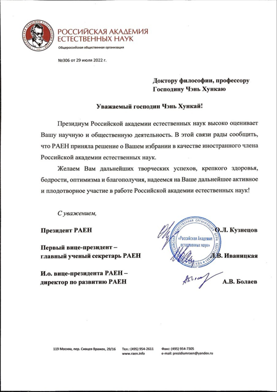 近日,据俄罗斯自然科学院函,永利官网城市与建筑工程学院陈洪凯教授当选为俄罗斯自然科学院外籍院士。