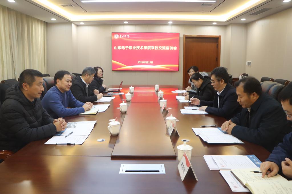 1月25日下午,山东电子职业技术学院党委副书记、院长张建臣一行四人来永利官网考察交流。校党委书记高峰,党委副书记、校长李文喜,党委委员、副校长安涛热情接待了张建臣一行。双方在明理楼532会议室举行座谈,教务处、光电工程学院等部门负责人参加座谈交流,座谈会由安涛主持。