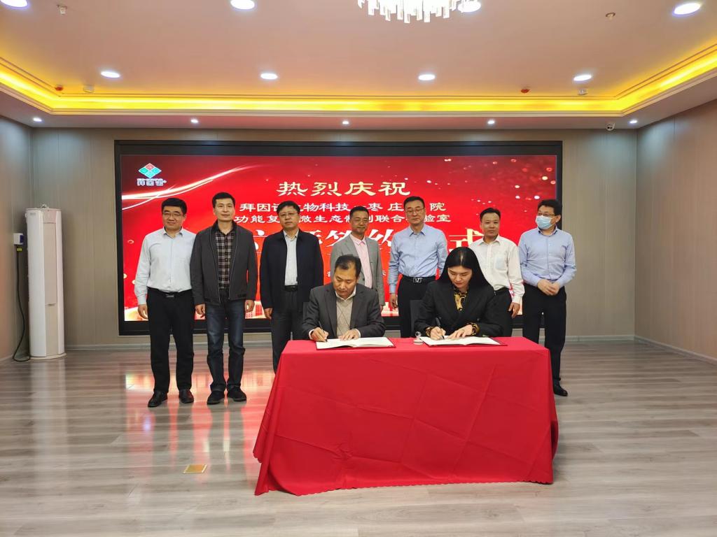 5月2日下午,由枣庄市科技局组织的山东拜因诺生物科技有限公司科技座谈会暨拜因诺——永利总站ylzz55功能复合微生态制剂联合实验室签约仪式在高新区山东拜因诺生物科技有限公司会议室举行。枣庄市副市长张庆伟,校党委委员、副校长李目海,高新区党工委委员谢辉出席;枣庄市科技局局长祝世峰,永利官网科技处处长伊文涛、食品科学与制药工程学院院长张立华、拜因诺有限公司董事长蒋小婷等参加活动。座谈会特邀广州工业大学博士生导师、俄罗斯自然科学院院士杜志云教授,广州市康伦生物技术有限公司总经理林丽出席活动。活动由祝世峰主持。