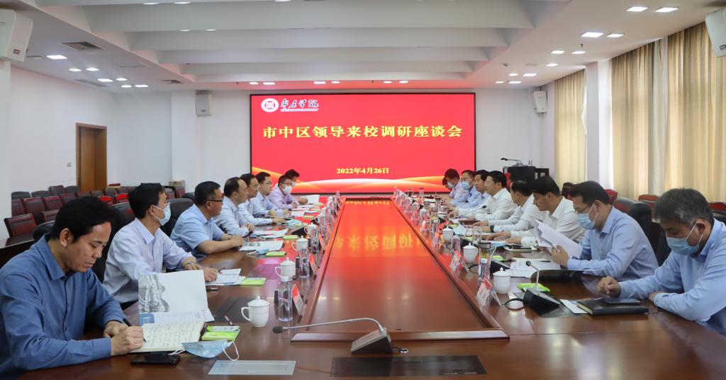 4月26日下午,市中区委书记宋磊,区委副书记、区长韩耀辉等一行9人莅临市中校区调研。校党委书记曹胜强、校长李文喜、副校长丰雷热情接待了宋磊一行。区人大常委会主任、党组书记侯宗伟,区委常委、办公室主任靳勇,区委办分管日常工作的副主任、区档案局局长于殿亮,区政府办公室主任徐敏,区教育和体育局局长宋钢,区卫生健康局局长焦艳红,齐村镇党委书记刘立人,永利官网办公室、学生工作处、教务处、后勤服务处、保卫处等部门负责人陪同调研。