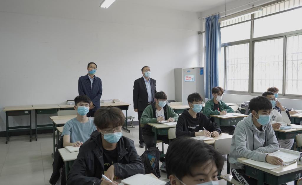 4月15日下午,市中校区线下教学复课首日,党委书记曹胜强、校长李文喜深入教学班级,了解线下教学的恢复情况,学校办公室、教务处及学生工作处相关负责人陪同调研。