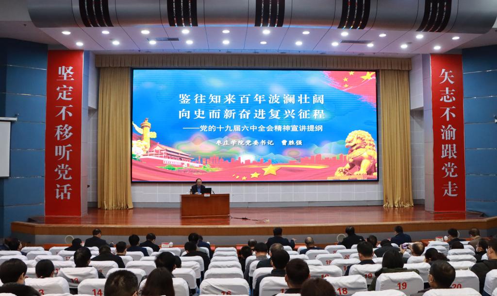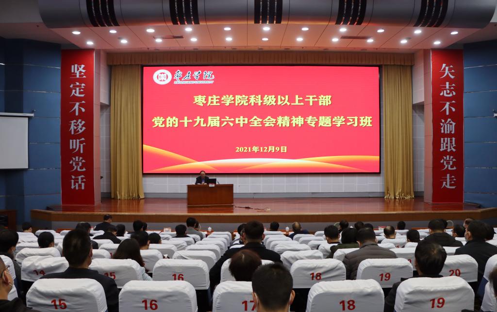 12月9日下午,永利官网十九届六中全会精神专题学习班开班,校党委书记曹胜强以《鉴往知来百年波澜壮阔 向史而新奋进复兴征程》为题,在综合楼学术报告厅作党的十九届六中全会精神宣讲报告。校领导李文喜、曾宪明、李目海、丰雷、张昌林、林勇出席,省委党史学习教育第四巡回指导组成员苗素军到场巡听,学校副科级以上干部共200余人到场聆听报告。新城校区在明理楼201会议室设分会场同步直播。
