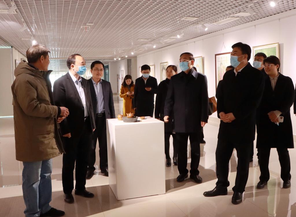 随后,刘天东一行来到博雅楼参观了永利官网美术与艺术设计学院青年学生美术作品展、学生社团民间手工艺协会作品展,认真听取了相关介绍,并建议学院下一步可以积极面向社会举办作品展,以地方元素为创作题材,更好服务地方发展,为枣庄“工业强市 产业兴市”贡献学院力量。