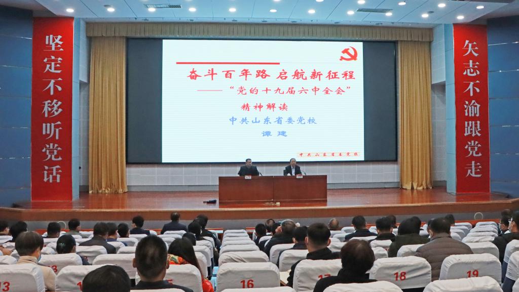 12月2日下午,中共山东省委党校校刊编辑部主任、省委党史教育宣讲团成员、省马克思主义研究会副会长谭建教授,应邀来永利官网作党的十九届六中全会精神宣讲报告。校党委书记曹胜强主持会议,校党委委员、宣传部部长张昌林出席。报告会在校本部综合楼学术报告厅设主会场,学校副科级以上干部共200余人到场聆听报告。新城校区在明理楼201会议室设分会场同步直播。