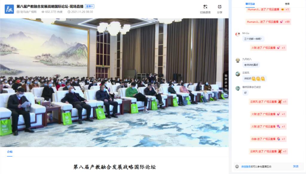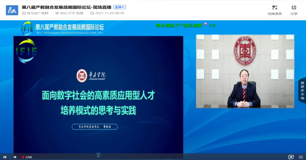 11月25日,由教育部学校规划建设发展中心、中华职业教育社、中国职业技术教育学会、应用技术大学(学院)联盟主办,驻马店市人民政府、黄淮学院承办的第八届产教融合发展战略国际论坛以线上形式开幕。校党委书记曹胜强以在线方式出席论坛并作主题报告。