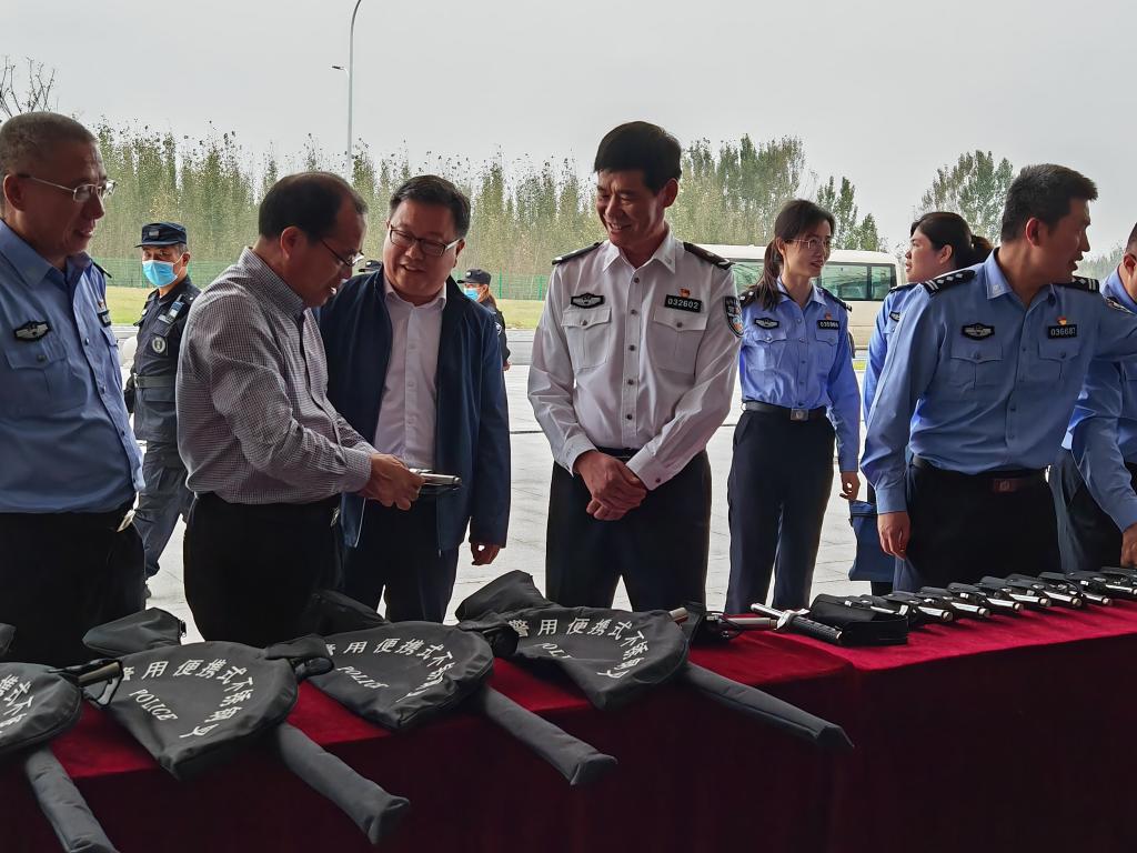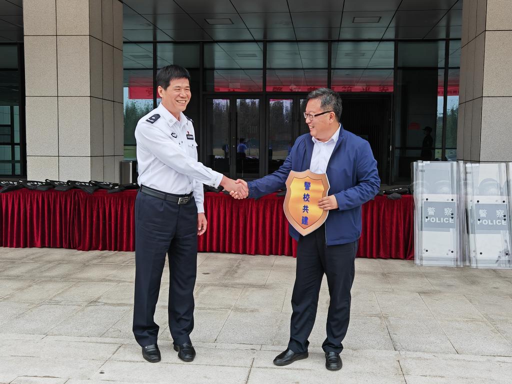 座谈会后在明理楼前举行了警用装备赠送仪式,丰雷代表学校接受了市公安局赠送的警用头盔、防爆盾牌、警棍、警用钢叉等装备。