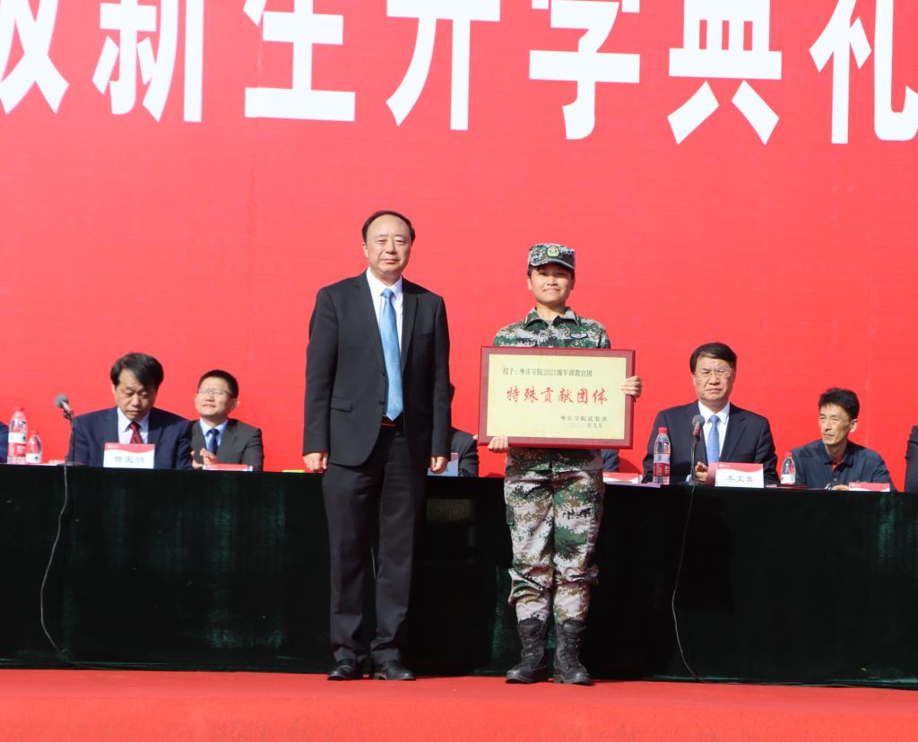 校党委书记曹胜强、校长李文喜为军训教官集体颁发特殊贡献奖牌。
