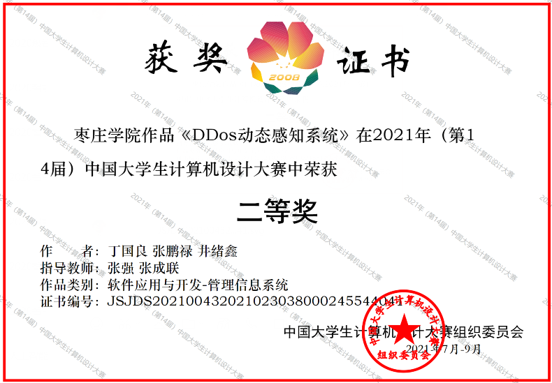大赛自2021年3月启动报名,经过校内选拔赛及省赛多重考验,人工智能学院学生丁国良、张鹏禄、井绪鑫三人的作品《DDos动态感知系统》成功晋级国赛。三名同学在指导教师张强老师和张成联老师的悉心指导下,积极准备决赛答辩,最终荣获全国二等奖。另外,在山东省省级赛区中,永利官网人工智能学院、信息科学与工程学院和光电工程学院共有21组同学的参赛作品获得一等奖3项、二等奖3项、三等奖11项、优秀奖4项,成绩的取得充分展现了永利官网学生良好的综合素质和学科竞赛创新能力。