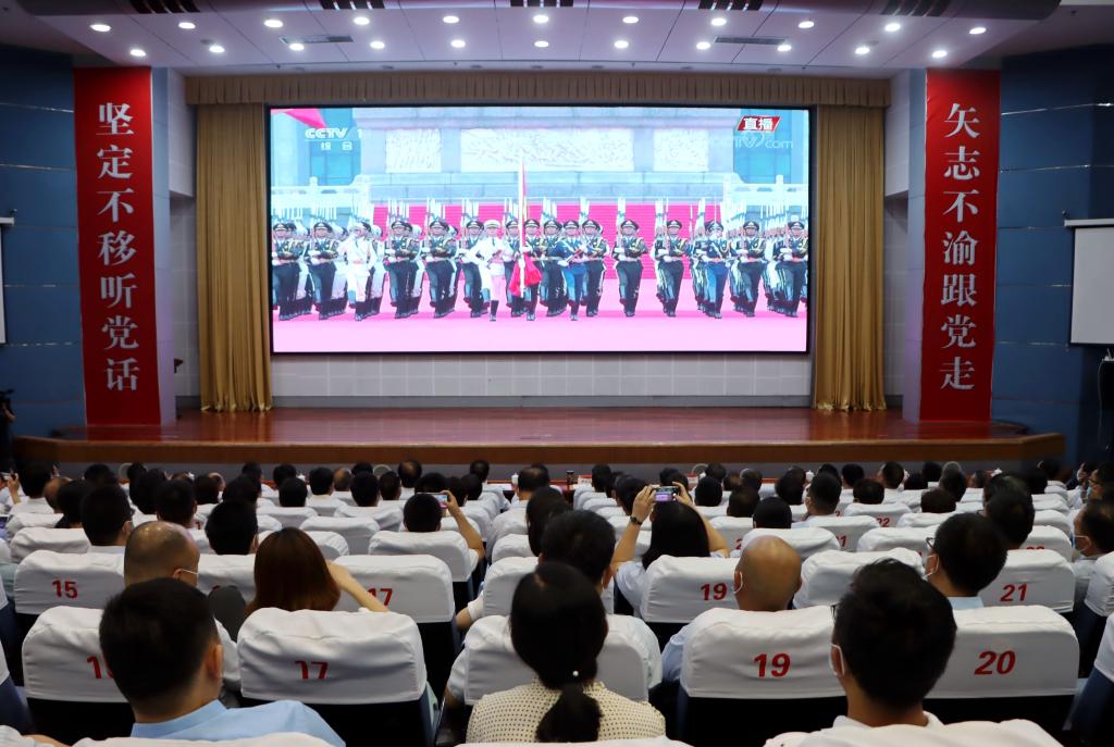 镜头中,天安门广场的东西两侧伫立着两排红旗迎风招展,鲜艳夺目,也将今天的天安门广场映衬得格外喜庆。空中护旗梯队飞行拉开了庆祝表演序幕,随着100响礼炮响彻云霄,国旗护卫队护卫着五星红旗从人民英雄纪念碑行进至广场北侧升旗区,全场齐声高唱中华人民共和国国歌,注视着五星红旗冉冉升起。大家神情专注、认真聆听习近平总书记重要讲话。总书记的讲话字字铿锵有力、句句掷地有声,令在场师生倍受鼓舞,会场不时响起热烈的掌声。