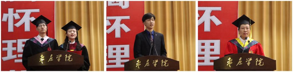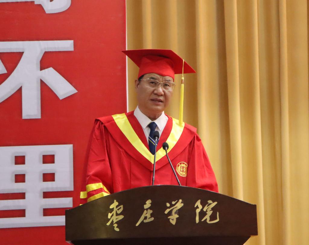 奋斗路正长,行者方致远。在毕业生即将踏上人生新征程之际,李文喜代表学校送上三点嘱托和祝福:第一,期待同学们涵养家国情怀,勇担时代使命。热爱祖国、报效祖国同样是每个枣院人的心之所系、情之所归。希望同学们在今后的人生旅程中,能够始终胸怀“国之大者”,始终把自身的“小我”,融入到祖国的“大我”、人民的“大我”之中,让青春在磨砺中出彩、在奋斗中升华,为新时代党和国家事业发展贡献智慧和青春力量。第二,期待同学们勤于修身养德,锤炼过硬本领。完善人格、涵养道德是我们一生必须追寻的目标。同学们唯有保持积极的人生态度,培养良好的道德情操,持续不断地努力学习,才能练就自我发展的强大“内核”、构造自身“硬件系统”,成为新时代国家和民族可信赖、可依靠的“硬核”青年。第三,期待同学们永葆创新精神,争做开路先锋。创新是社会发展的第一动力和永恒主题,也将是同学们建功立业的根本途径。希望同学们今后无论是继续深造还是投身工作,都能始终褒有“敢为天下先”的锐气和甘坐“冷板凳”的定力,把激昂的创新创业梦融入伟大的中国梦,勇攀科技高峰,勇闯科技创新“无人区”,争做创新报国的引领者和实干家。