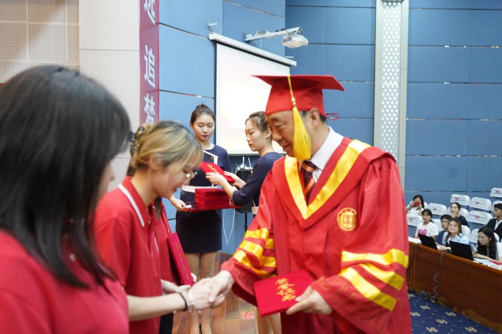 典礼上,20名毕业生代表向教师代表敬献鲜花,深切表达了对母校的深深眷恋、对师长的无限感激以及对校园生活的依依不舍。典礼在浓情厚意、充满感动的氛围中顺利落下帷幕。典礼结束后,校领导和毕业生代表在综合楼前合影留念。