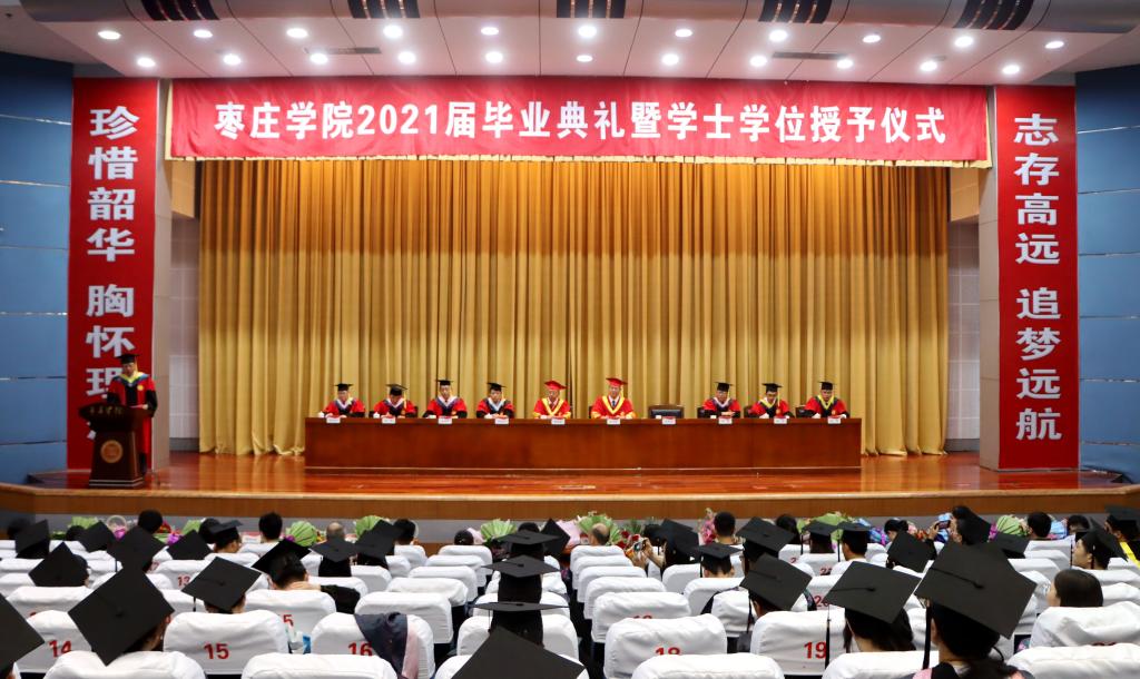 毕业典礼坚持以文化人、文化育人。印有“志存高远 追梦远航”“珍惜韶华 胸怀理想”字样的对联写真分列在会场两侧,鲜红的写真激励着毕业生们承时代使命、展奋斗风采,也祝福着毕业生们毕业快乐、鹏程万里。典礼前,播放了学校为2021届毕业生精心制作的毕业生MV《记念•枣院版》,动人的旋律、精心制作的视频,每一帧每一句都轻轻敲在学子心坎,久久萦绕脑海,泛起点点涟漪。下午三点整,在庄严雄壮的国歌声中,毕业典礼暨学士学位授予仪式正式拉开帷幕。