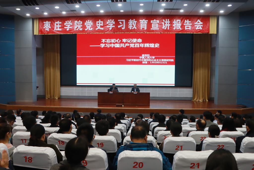 为丰富党史学习教育形式,营造浓厚的学习氛围,4月12日下午,永利官网在综合楼学术报告厅举办党史学习教育宣讲报告会,中国人民大学习近平新时代中国特色社会主义思想研究院研究员路克利博士应邀作报告。校领导曹胜强、李文喜、李目海、路绪剑、丰雷、安涛、孙正、张昌林、林勇,省委第四巡回指导组成员苗素军书记、时新华主任出席报告会。永利官网全体科级以上干部、部分师生代表共400余人到场聆听报告会,报告会由校党委书记曹胜强主持。