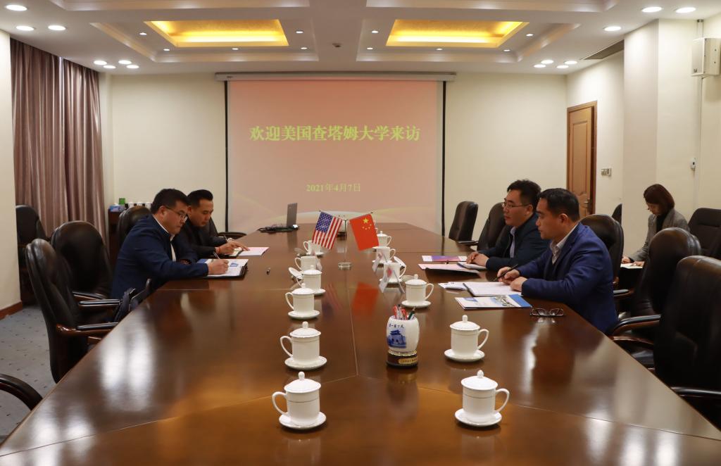 4月7日下午,美国查塔姆大学中国代表处—宏瑞国际教育咨询有限公司总裁刘旭一行2人来校就中美合作办学事宜进行洽谈。校党委书记曹胜强、副校长安涛在综合楼八楼接待室会见刘旭一行。国际交流处处长盛清银参加会谈。
