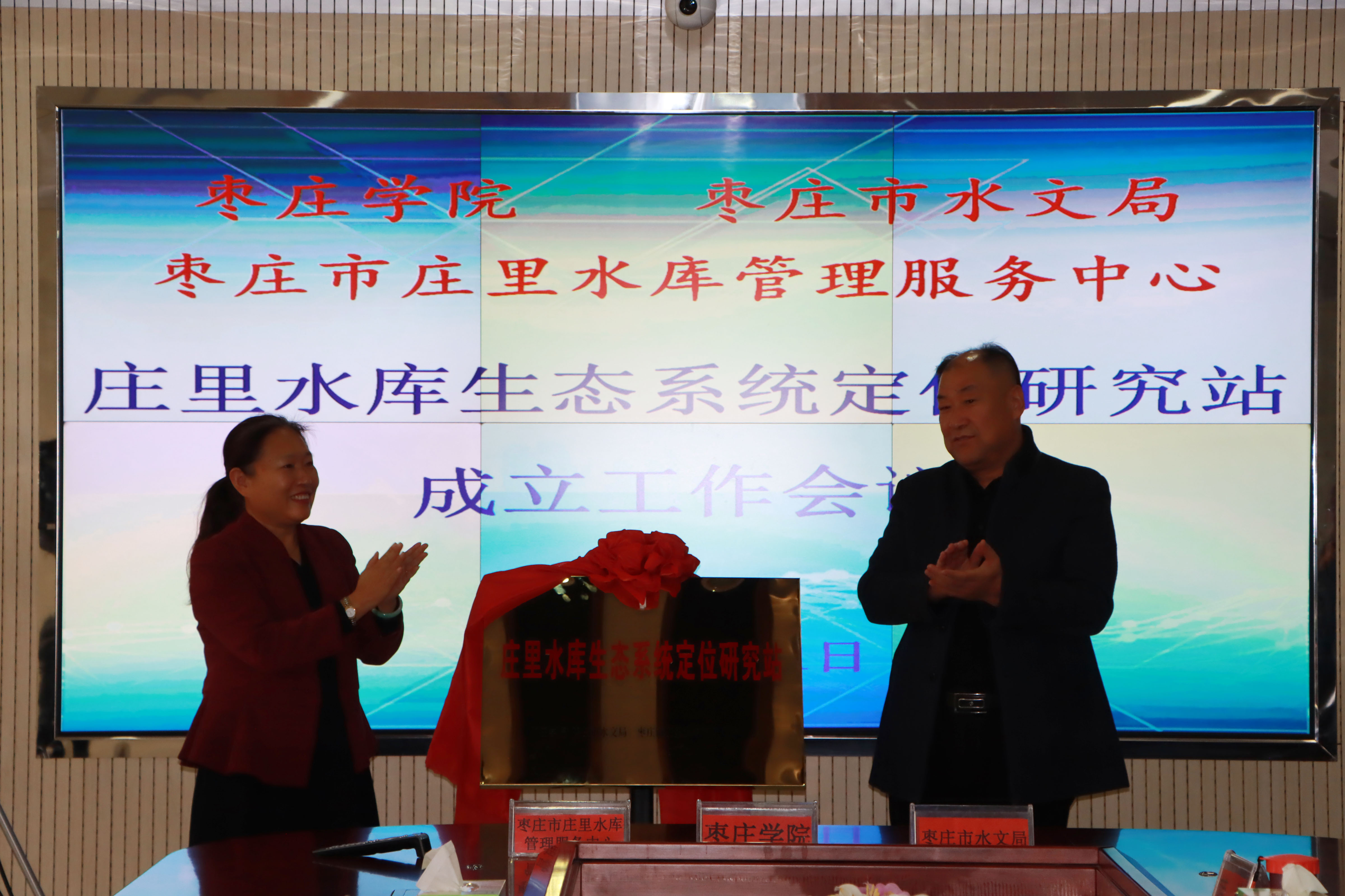 李丽清、闫维松共同为“枣庄市庄里水库生态系统定位研究站”揭牌。