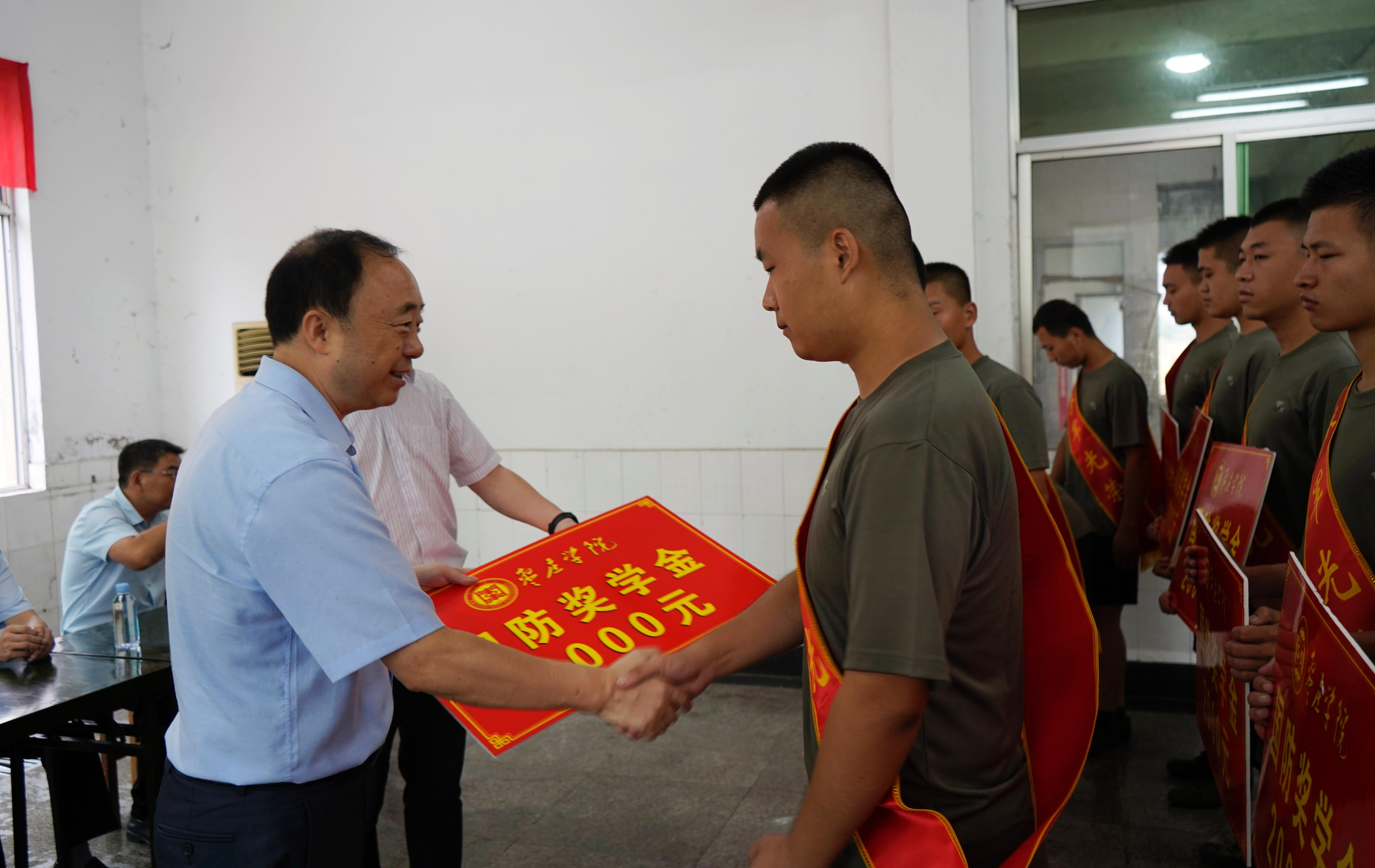 在训练基地,曹胜强仔细询问同学们的近期训练生活情况,为同学们颁发了国防奖学金,同时代表学校向应征入伍的同学表示祝贺,勉励大家在军营:一要忠于祖国、志存高远、勇担使命,时刻牢记习近平总书记提出的“建设一支听党指挥、能打胜仗、作风优良的人民军队”的总体要求,以优良的作风和良好的精神风貌,担负起一名军人的神圣职责。二要以国为家、忠于职守、敢于超越,早日成为“政治合格、军事过硬、作风优良、纪律严明”和“有灵魂、有本事、有血性、有品德”的新一代革命军人。三要牢记“兼爱尚贤、博物戴行”之校训,勤学善思,苦练本领,努力提高政治素养和专业素养,在学习中奉献,在奉献中成长,努力成为一名有理想、有本领、有担当的优秀军人,让枣院精神在军营闪光,为母校争光添彩。