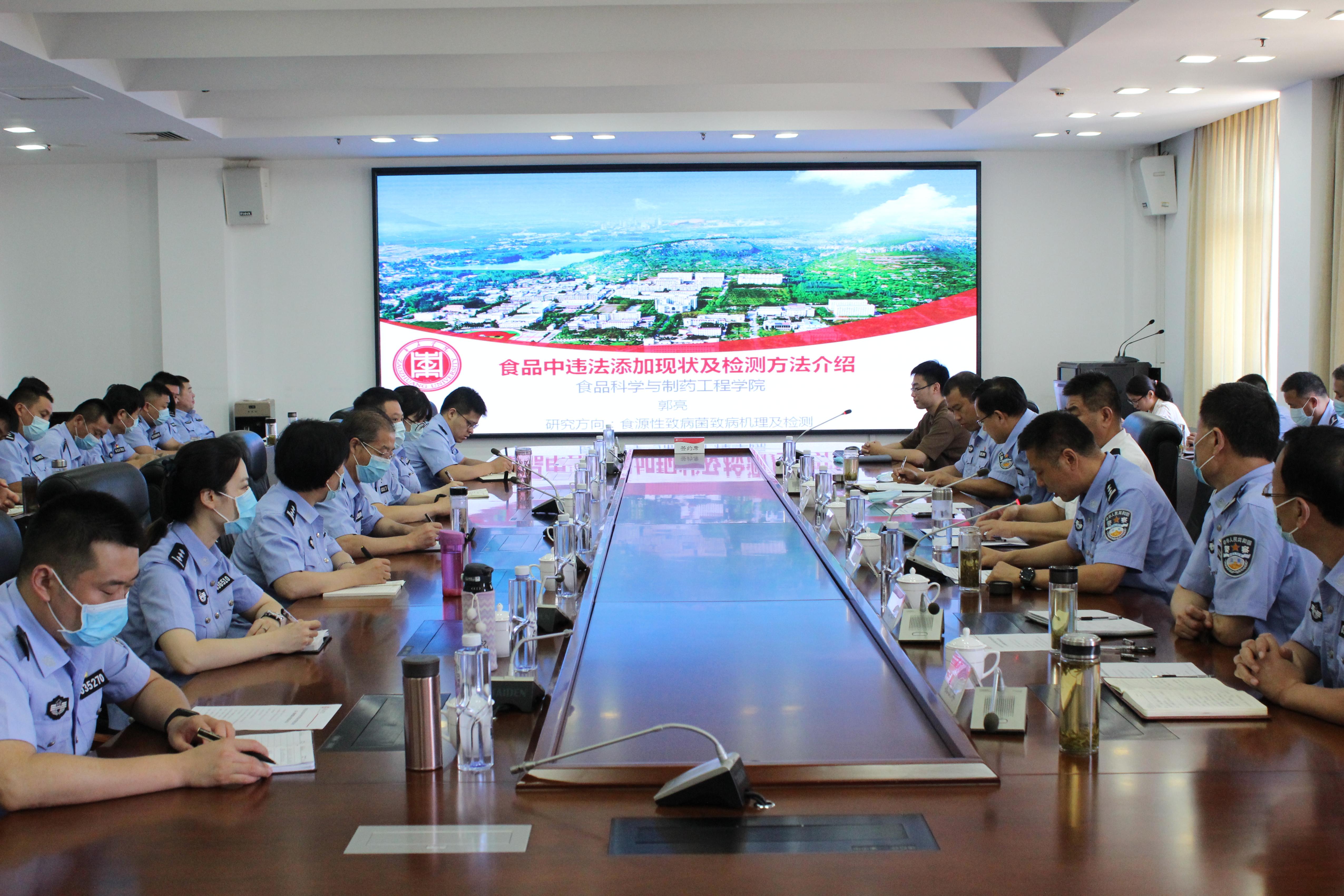 签约仪式后,开展了第一期校警联合培训活动,食品科学与制药工程学院专任教师郭亮、张沛先后为市公安局参训人员做了《食品中违法添加现状及检测方法介绍》《非法添加物检测技术》等内容的专题培训。