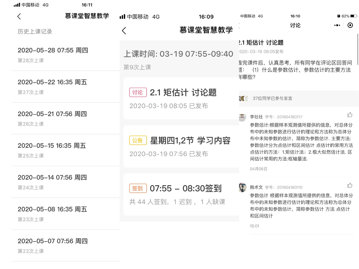 《数理统计》是一门收集、整理、分析数据并进行统计推断的科学,既具有理论性又具有应用性。通过本课程的学习使学生掌握数理统计学的基本理论方法,并为后继课程打好基础。该课程是应用统计学专业的专业教育必修课,也是统计学专业的专业基础课程,该课程的学习直接关系到后续专业课的学习,因此在统计学专业的学习中起着至关重要的作用。本学期由于疫情形势严峻,广大师生不能按时到校上课,为了做到“停学不停课”,保证学生在家依然有获取专业知识的机会,线上教学正在有条不紊的进行中。为了保证学习质量,在网络教学过程中,数学与统计学院孙桂萍老师采用“慕课视频教学+慕课堂课堂管理+钉钉直播和微信答疑”相结合的教学模式,并取得一定的效果。其典型做法如下:
