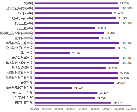 各院(部)的开课数、开课门次、班级数、教师数(人次)、学生数(人次)和学生上课率情况如下图所示: