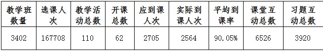 永利官网师生在雨课堂平台使用情况,根据大数据统计,由此查看本周教学班数量、教学活动总、开课总数、应到课人次、实际到课人次、课堂互动总数、平均到课率、习题互动总数,详情见下表: