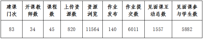 本周线上教学课程1073门、3042门次;参与授课教师809人,涉及教学班级周合计2241个,学生学习人次数169440;累计上线学习学生人次数占累计应上线学习人次数比例为99.32%。