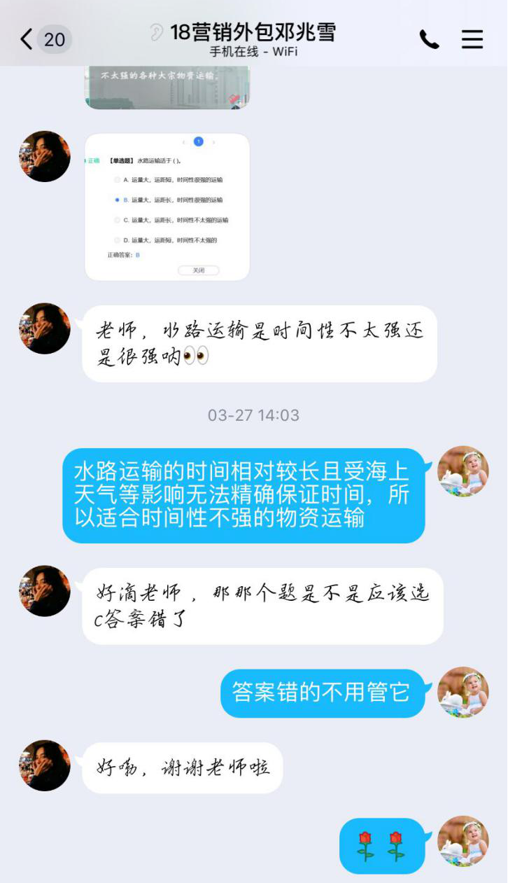 批改平台中的作业及章节测试,掌握学生各个章节知识点的掌握情况,以便及时有针对性地进行指导。学生对于课程中的疑问可以随时通过微信或者QQ私信老师,进行差异化辅导。