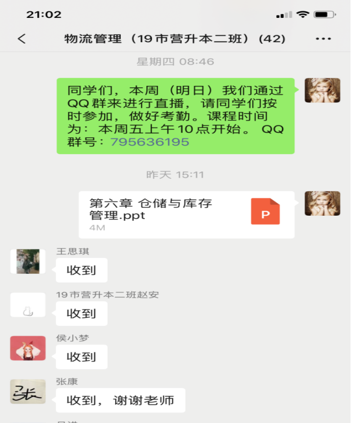 《物流管理》是市场营销升本专业的一门专业核心课程,该课程对学生的知识架构、获取知识能力和实践应用能力的提升、专业素质培养起到了重要支撑作用。按照学院提出的在线教学与线下授课“同质等效”的要求,经济与管理学院马宏茹老师积极参加学校组织的“混合式教学教师培训系列课程”培训,在充分理解线上教学与混合式教学的理念、方法和手段后,综合考虑课程特点及学生的情况,她主要采用“智慧树学习平台+QQ直播分享屏幕+微信师生群”的方式开展线上教学,较好地保障“停课不停教,停课不停学”,具体做法如下: