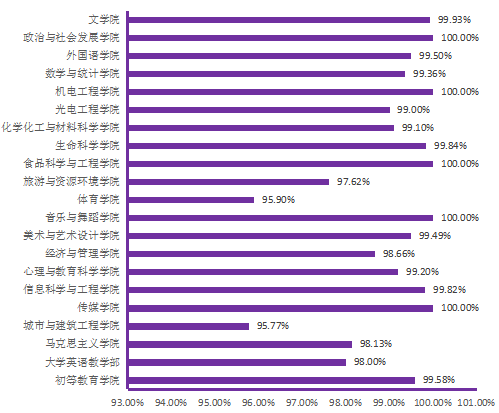 各院(部)的开课数、开课门次、班级数、教师数(人次)、学生数(人次)和学生上课率情况如下图所示: