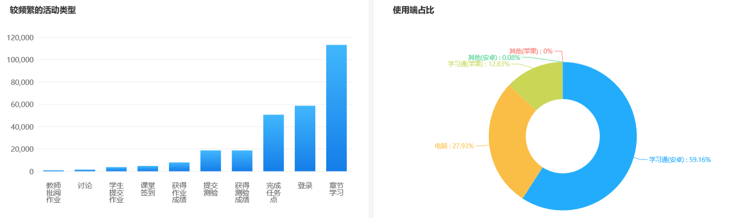 根据超星平台提供的大数据分析,可以查看本周课程打开次数、课程访问排行、较为频繁的活动类型、活跃度最高的院系和学习端口占比分别为: