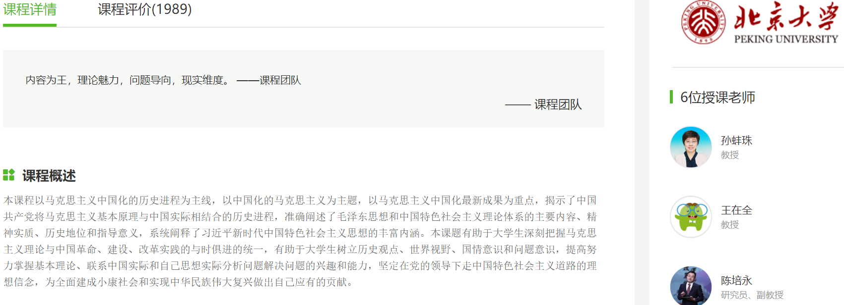 《毛泽东思想和中国特色社会主义理论体系概论》课程是本学期面向全校2018级本科生和2019级专科生开设的通识教育必修课,旨在培养当代大学生运用马克思主义立场、观点和方法认识问题、分析问题和解决问题的能力。本课程教学团队在教研室主任李东清老师的带领下,集思广益,精心选择了中国大学MOOC线上资源。