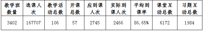 永利官网师生在雨课堂平台使用情况,根据大数据统计,由此查看本周教学班数量、教学活动总、开课总数、应到课人次、实际到课人次、课堂互动总数、平均到课率、习题互动总数,详情见下表: