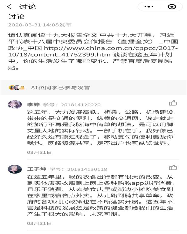 在中国大学MOOC的基础上,邸娟老师建立了用于签到、讨论、练习和发布作业的慕课堂,激活了同学们线上学习的热情和动力,使同学们在忙碌和充实中,不断提高自身本领。同时,利用教学班微信群作为课前信息发布和线上教学补充,最大程度上保证每节课的丰富性和完整性。