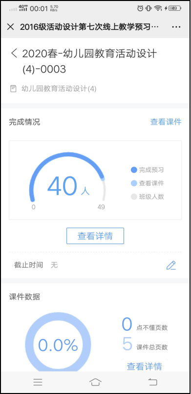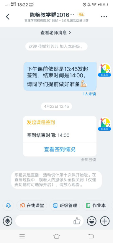 在每次上课前,陈老师都会将课件、知识点、课程时间分配、具体要求等提前发给学生,具体上课前一天再次沟通确认,以确保课程顺利进行。每堂课,陈老师都会提前30分钟进入网络课堂,把之前备课时的相关音频、视频资料发到微信群进行共享。通过雨课堂上传课前任务及课件资料,提醒学生课前预习,熟悉教学内容,基于课程实践的特点,发布课前要求,请学生课前思考,使线上教学更高效。通过后台数据及时查看学生预习情况,对未观看的学生及时在微信群提醒,督促学生按时认真完成。另外她每节课都会利用钉钉群发布上课通知,提前告知学生上课时间及教学任务,对于未阅学生可以通过免费钉钉电话或短信告知,以防学生忘记时间而耽误上课,确保到课率。