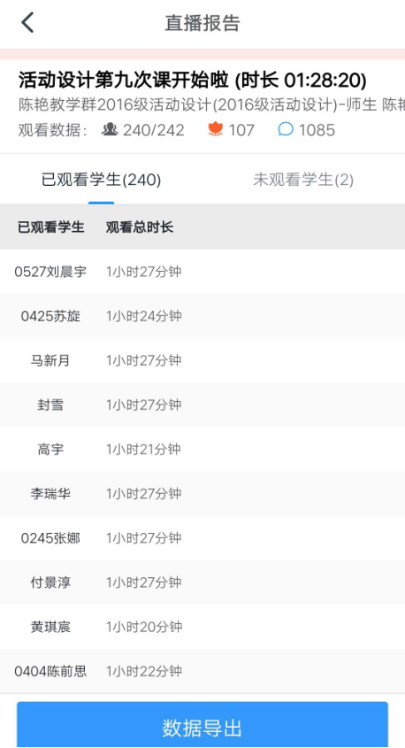课后通过钉钉实时监测学生观看时长,不仅知道学生上课情况,还能更详细的了解学生上课多长,有助于教师掌握真实的上课情况。对于未观看的同学及时沟通,提醒学生通过观看预习课件、直播视频的方式补课并单独通过作业参加课后检测。